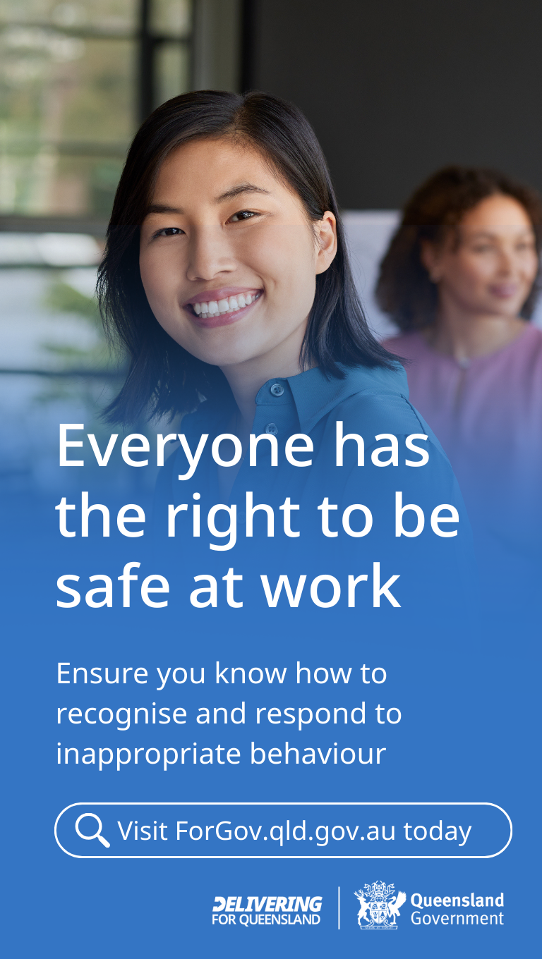 All Queensland public sector workplaces must provide a safe, respectful and inclusive workplace free of sexual harassment and discrimination.